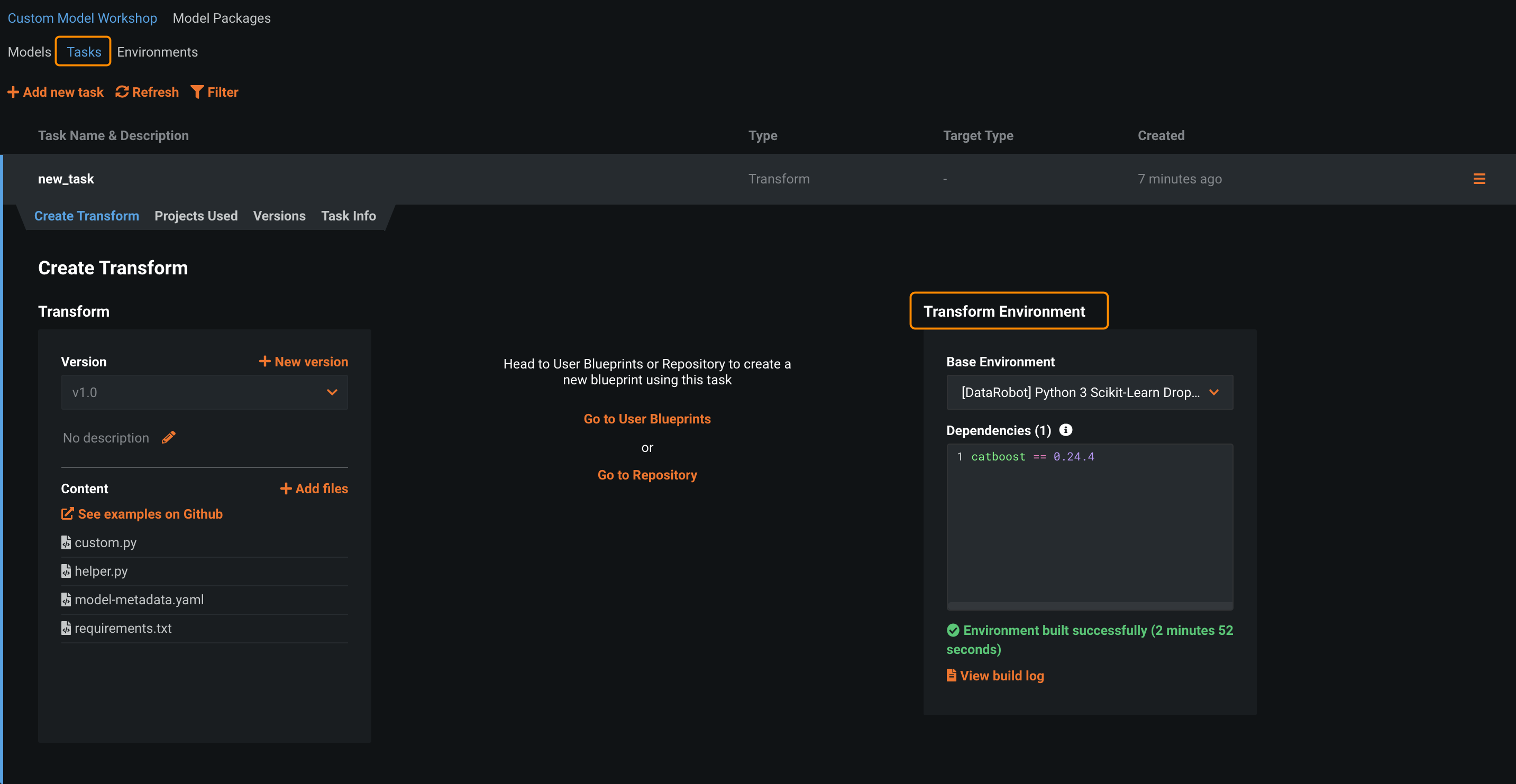 - The task is compatible with DataRobot requirements and can be used to build a blueprint.