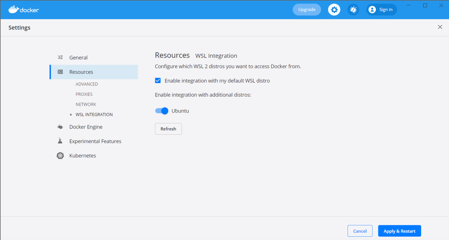 - Under Resources > WSL integration > Enable integration with additional distros, toggle on Ubuntu.