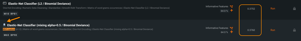 Once trained, the model appears in the project Leaderboard where you can compare its accuracy with other custom and DataRobot models. The icon changes to indicate a user model. At this point, the model is treated like any other model, providing metrics and model-agnostic insights and it can be deployed and managed through MLOps.