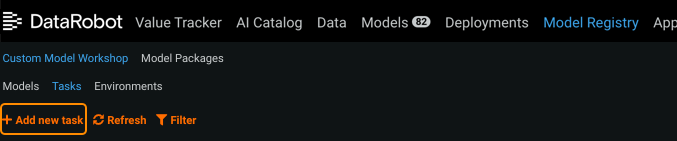 To create a new task, navigate to Model Registry > Custom Model Workshop > Tasks and select + Add new task.