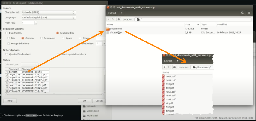 Upload an archive file (e.g., zip) with a dataset file that references PDF documents relative to the dataset (document columns in the dataset contain paths to documents).
