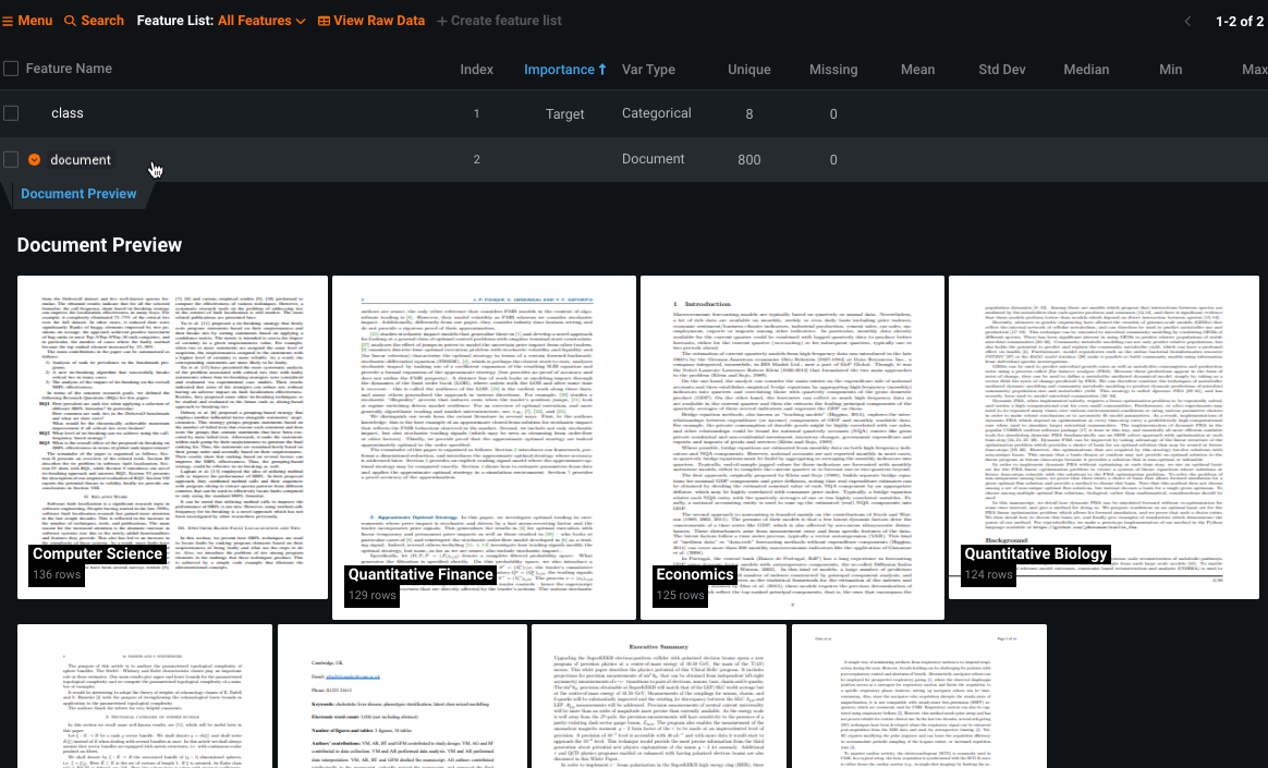PDF documents used for modeling are extracted by tasks within the blueprint and registered as a dataset made of a single text column, with each row in the column representing a single document and with the value being the extracted text—features of type document.