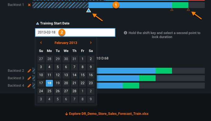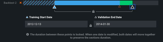 You may want to make backtest date changes without modifying the duration of the selected element. You can lock duration for training, for validation, or for the combined period. To lock duration, click the triangle at one end of the period. Next, hold the Shift key and select the triangle at the other end of the locked duration. DataRobot opens calendar pickers for each element: