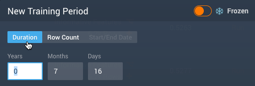 To change the training period a model uses, select the Duration tab in the dialog and set a new length. Duration is measured from the beginning of validation working back in time (to the left). With the Duration option, you can also enable time window sampling.