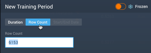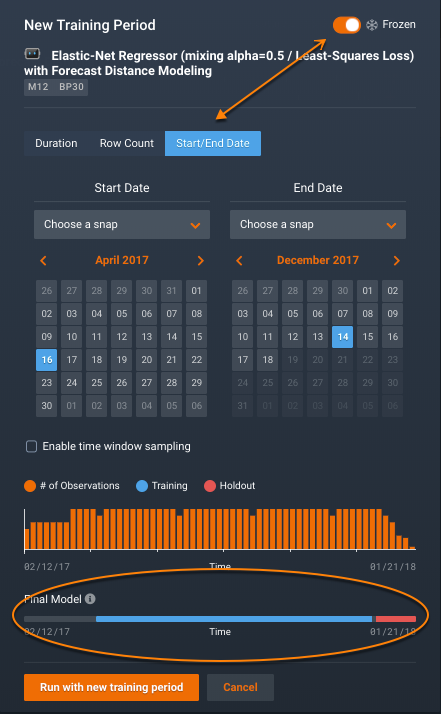 If you enable Frozen run by clicking the toggle, DataRobot re-uses the parameter settings it established in the original model run on the newly specified sample. Enabling Frozen run unlocks a third training criteria, Start/End Date. Use this selection to manually specify which data DataRobot uses to build the model. With this setting, after unlocking holdout, you can train a model into the Holdout data. (The Duration and Row Count selectors do not allow training into holdout.) Note that if holdout is locked and you overlap with this setting, the model building will fail. With the start and end dates option, you can also enable time window sampling.