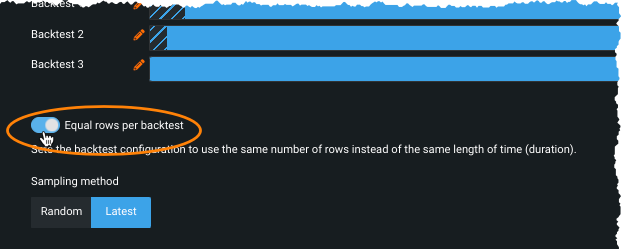 By default, DataRobot ensures that each backtest has the same duration, either the default or the values set from the dropdown(s) or via the bars in the visualization. If you want the backtest to use the same number of rows, instead of the same length of time, use the Equal rows per backtest toggle: