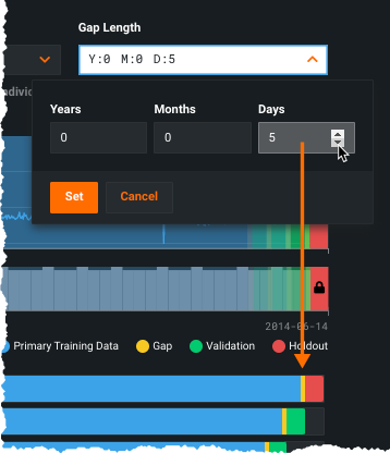 Regardless of whether you are setting training, gaps, validation, or holdout, elements of the editing screens function the same. Hover on a data element to display a tooltip that reports specific duration information: