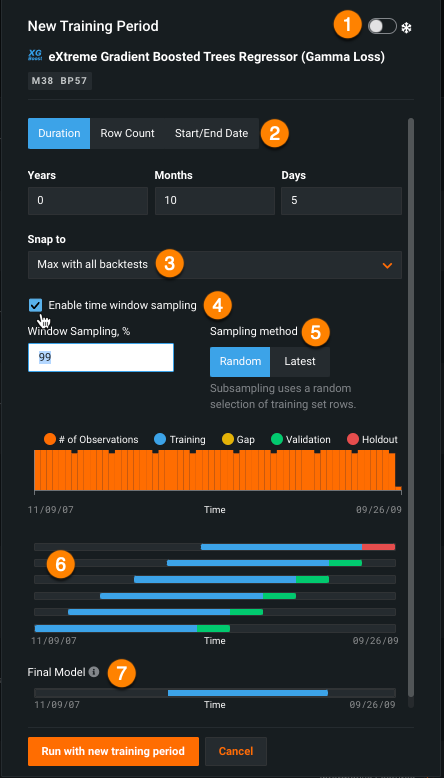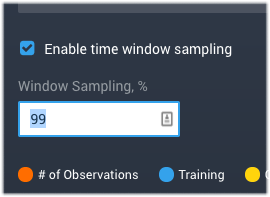 | 4 | Enable time window sampling | Train on a subset of data within a time window for a duration or start/end training mode. Check to enable and specify a percentage. |