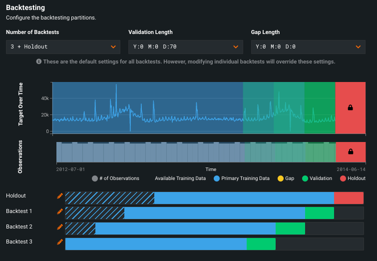 | 1 | Number of backtests | Configures the number of backtests for your project, the time-aware equivalent of cross-validation (but based on time periods or durations instead of random rows). |