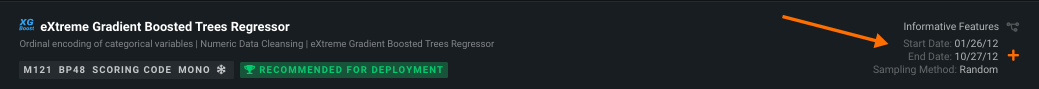 Models are trained on data between two ISO dates. DataRobot displays these dates as a date range, but inclusion decisions and all key boundaries are expressed as date points. When you specify a date, DataRobot includes start dates and excludes end dates.