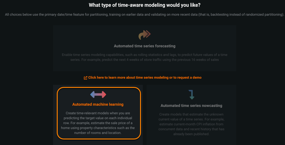Finally, set the type of time-aware modeling to Automated machine learning and consider whether to change the default settings in advanced options. If you have time series modeling enabled, and want to use a method other than OTV, see the time series workflow.