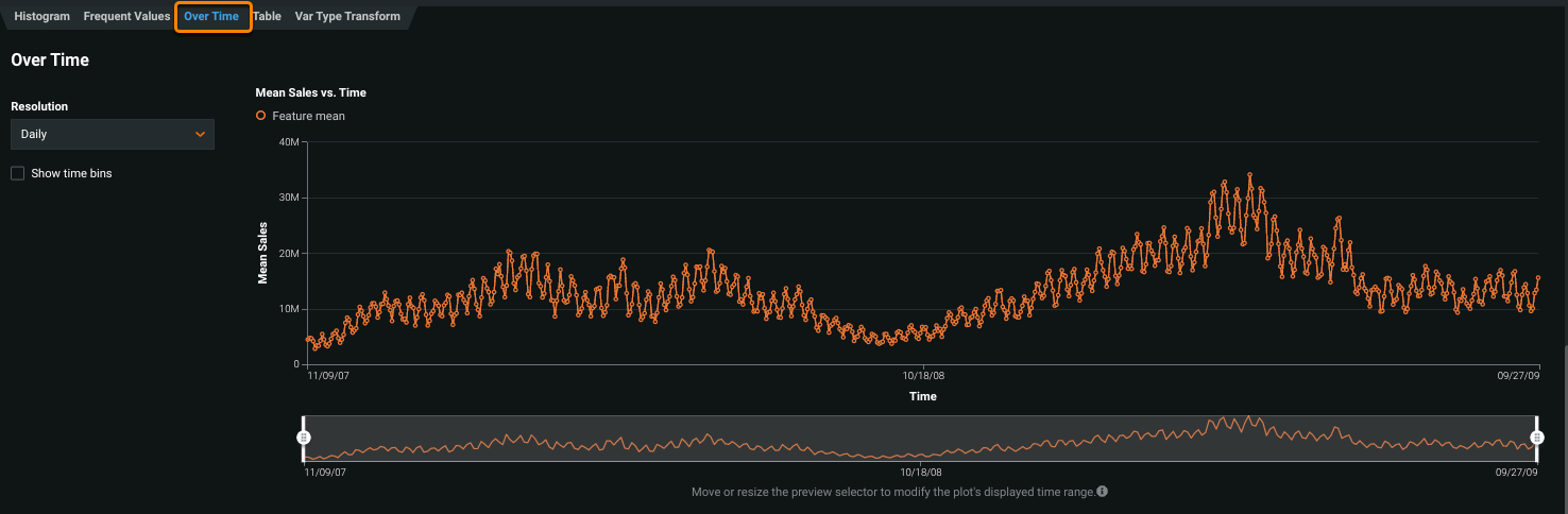 Explore what other features look like over time to view trends and determine whether there are gaps in your data (which is a data flaw you need to know about). To access these histograms, expand a numeric feature, click the Over Time tab, and click Compute Feature Over Time: