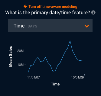 From the dropdown, select the primary date/time feature. The dropdown lists all date/time features that DataRobot detected during EDA1.