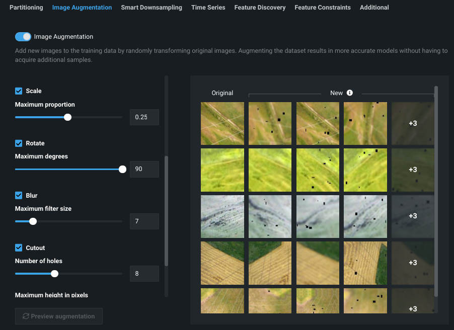 Below are some example use cases to help illustrate how you might leverage domain knowledge of your dataset to craft a beneficial augmentation strategy. You can try the suggestions and then modify the settings using the Advanced Tuning tab. For each, the first screenshot explores the images by expanding the image feature in the Data tab. The second shows previews from the Advanced options > Image Augmentation tab.