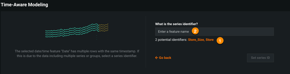 1. Select a series identifier, either by clicking on one that DataRobot identified (1) or manually entering a valid column name of a known series (2).