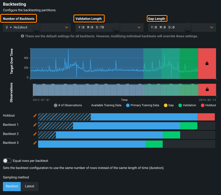 Backtesting simulates the real prediction environments a model may see. Use backtests to evaluate accuracy given the constraints of your use case. Be sure not to build backtests in a way that gives you accuracy but are not representative of real life. (See the description of date/time partitioning for details of the configuration settings.) The following describes considerations when changing those settings.