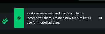 When features are restored, they are not added into existing feature lists. To use the new features as part of your modeling dataset you must create new feature list(s) that incorporates them. For example:
