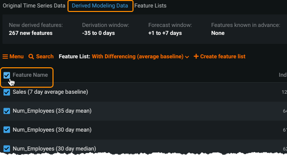 From the Derived Modeling Data tab, select the best performing feature list. Check the Feature Name box to select all features in that list.