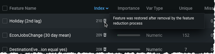 To verify the restoration, click the index column. DataRobot re-sorts the features, listing the restored features first and marking them with a restoration icon (