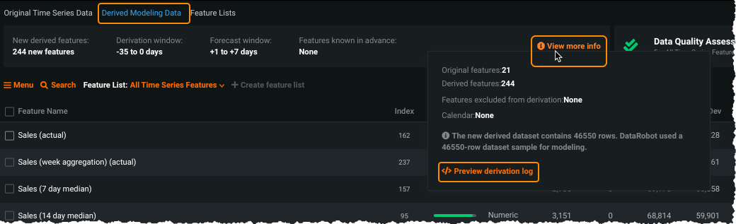 In any time series project, DataRobot generates derived features based on the window settings at project start. DataRobot then runs a feature reduction algorithm, removing features it detects as low impact. Sometimes, however, the algorithm may remove some important features during the feature reduction process—features that you want included in the generated feature lists or evaluated for feature impact. Some examples of this are certain calendar-derived features or a particular numeric statistic of a financial variable. After EDA2 completes, you can add these features back into your available derived modeling data.