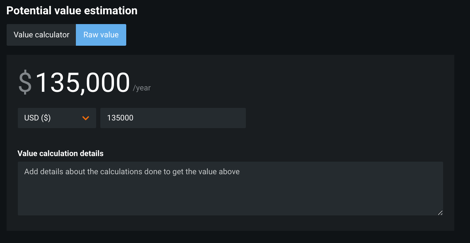 Use the raw value method to provide an estimated value manually. Specify a currency and expected annual value for the value tracker. Provide details for how you calculated the value in the text box.