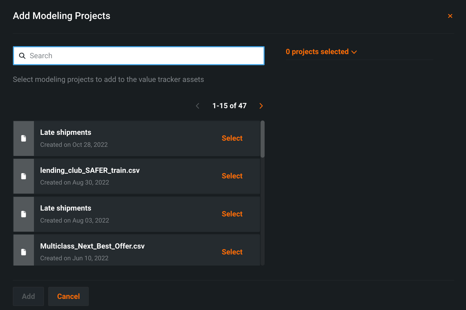 You are directed to the attachment modal, listing all objects of the chosen type that you currently have access to. In order to attach objects, click Select next to the object. You can select multiple objects at once. When you have selected the projects to attach, click Add.