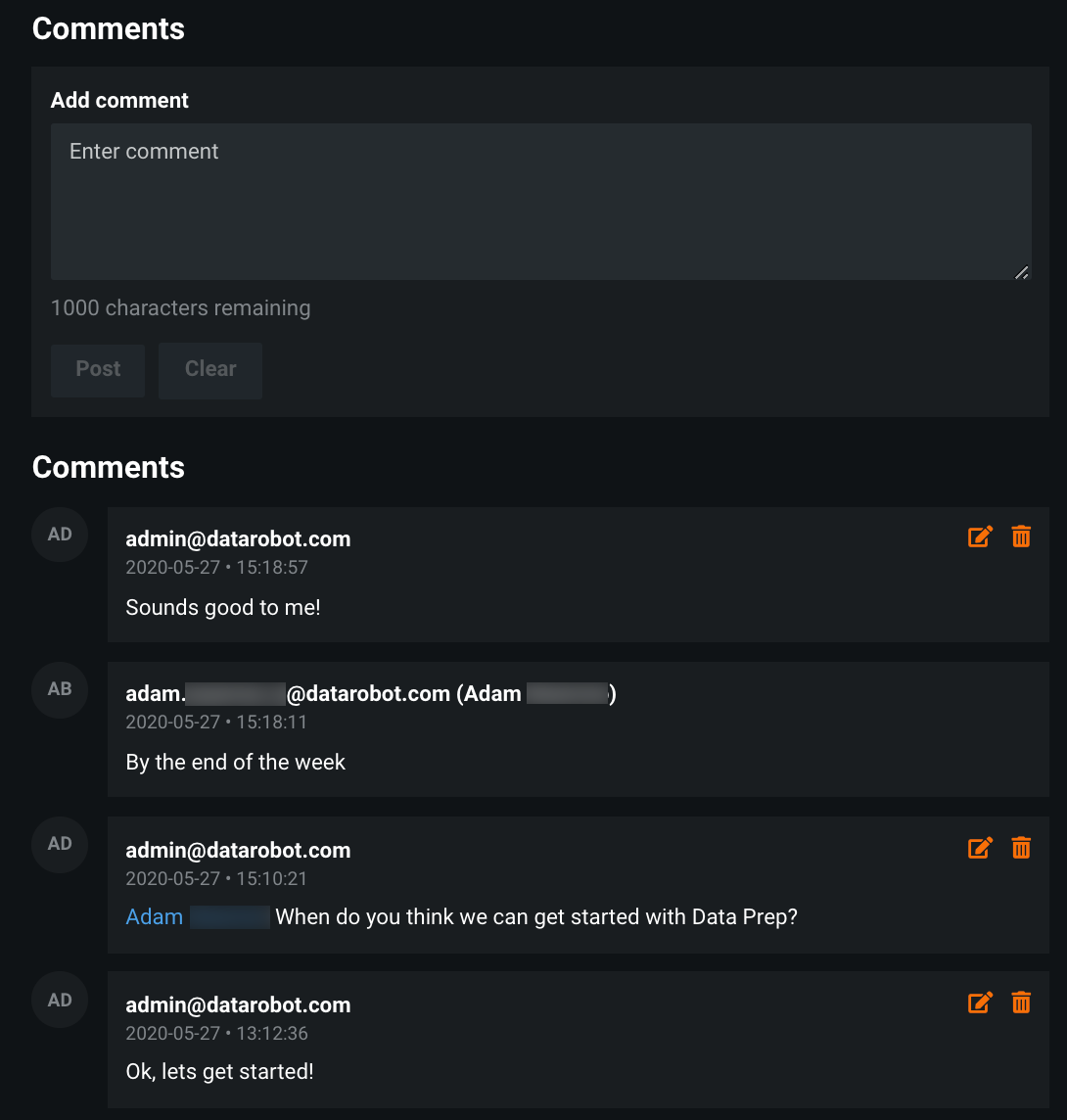 In addition to the three action icons, each value tracker has a Comments sections, where all users who have a value tracker can host discussions. The comments support tagging users and sending email notifications to those users. Comments can be edited or deleted.