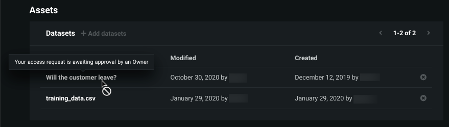 The Owner of the asset will receive an email notification of your request. While you are awaiting approval, you will see the following message when you hover over the asset: