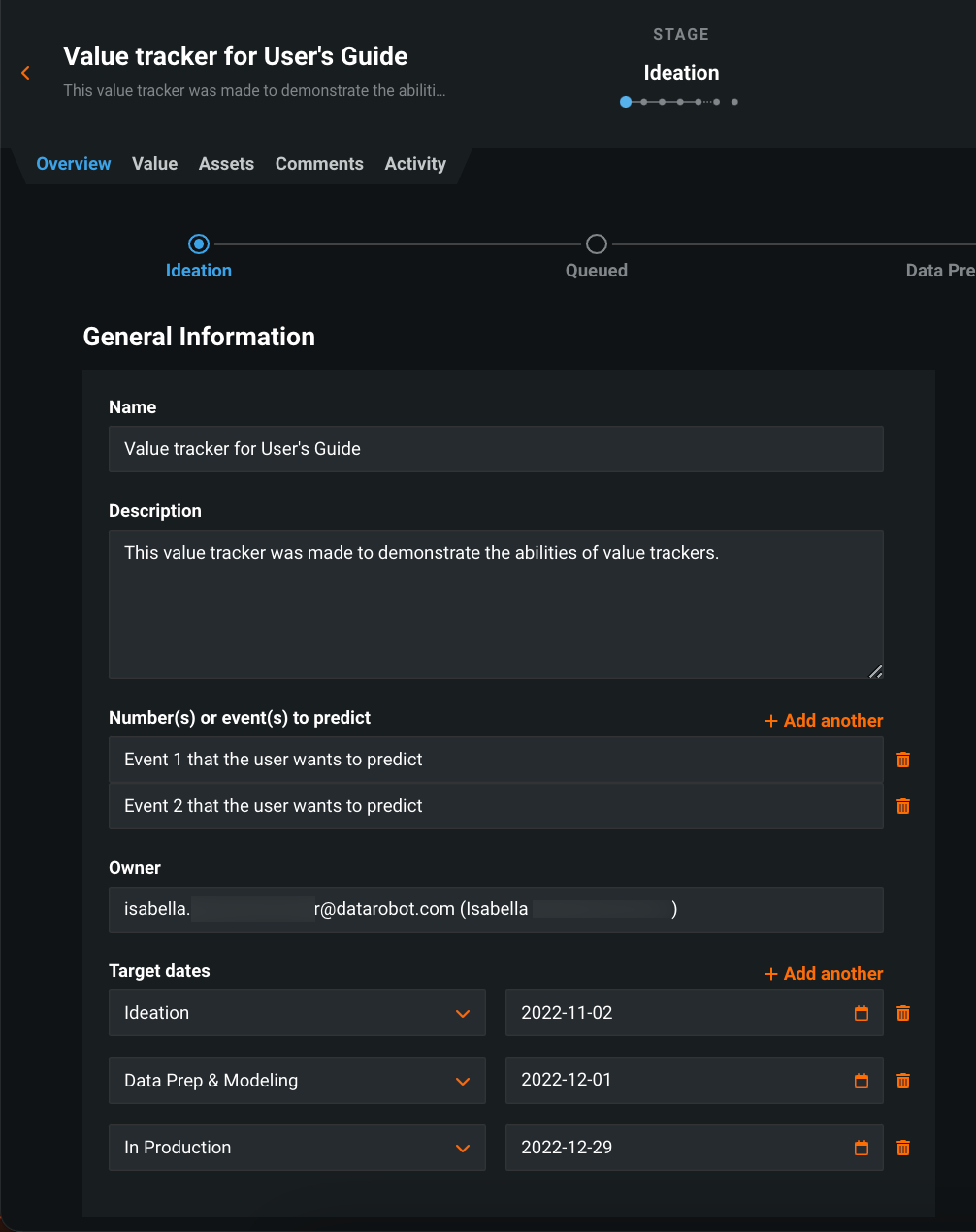 From the dashboard, select + Add new value tracker. This brings you to the Overview tab for the new value tracker. Complete the fields to provide general information about what you want to track.