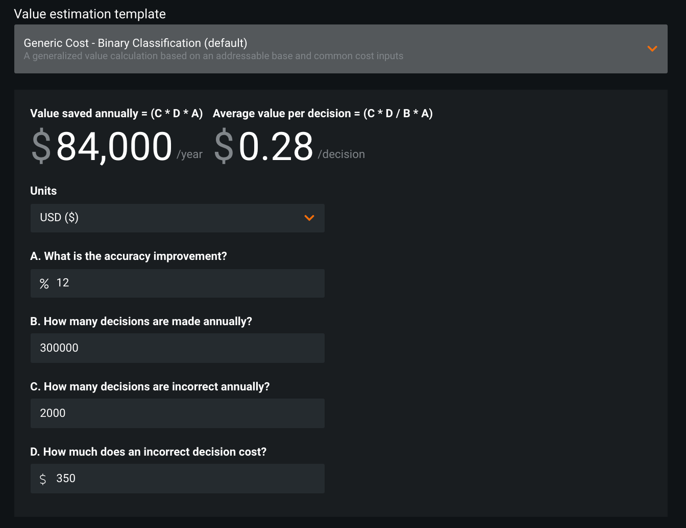 To use the value calculator, you must choose from either the Binary Classification or Regression template. Provide numeric values to answer the questions that accompany each template. The example below displays the template for a Binary Classification value tracker.