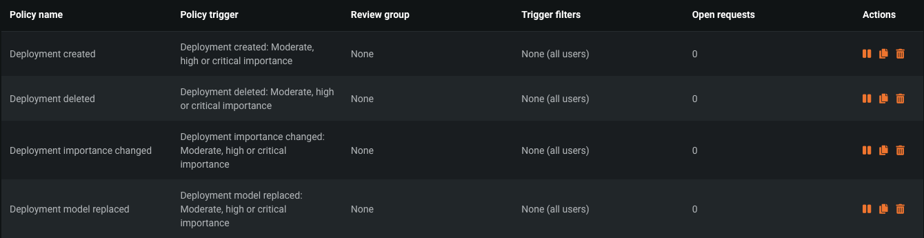 The following policies are provided by default, covering the four deployment events available as policy triggers.