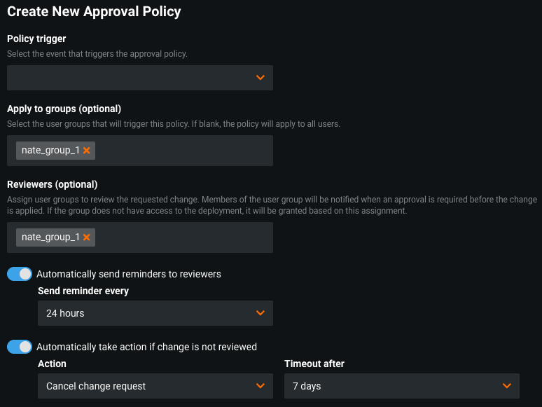 This brings you to the policy creation page. The user groups that trigger the policy, the reviewers, and the reminder settings are carried over from the existing template policy. You must provide a new policy trigger and optionally list the groups for which you want to apply the policy.