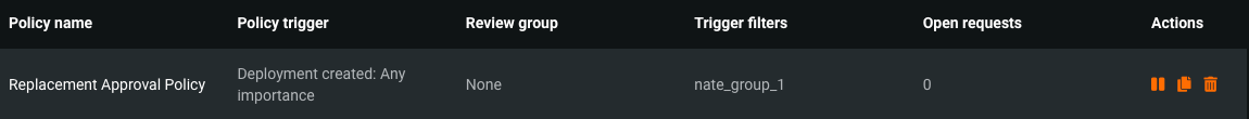 If you want to temporarily disable a policy, you can do so from the Approval Policies page. Under the Actions header, select the pause icon (