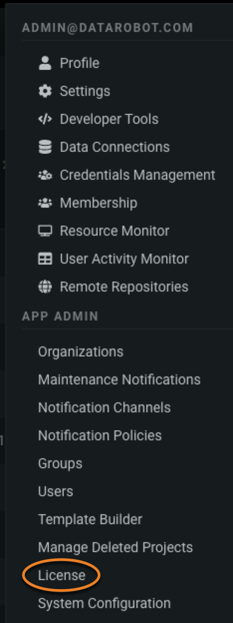 This page explains how to apply a DataRobot license using either the application interface or the DataRobot API. Note that this workflow is exclusive to administrators, and requires you to be logged into DataRobot with admin permissions.