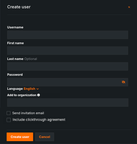 In the displayed modal, enter the username (i.e., email address), first name, and password for the new user (other account settings are optional at this point). Refer to Change your password for password requirements.