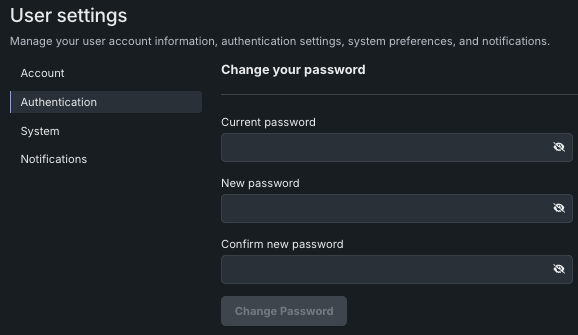 You can change passwords for your own user accounts. If you need help generating a new password for the default administrator, contact Customer Support.
