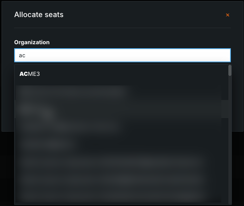In the Allocate seats modal, select an organization and enter the number of seats to allocate.