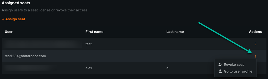 Seats can be removed from users by clicking the Actions menu for the user in the Assigned Seats section and selecting Revoke seat.