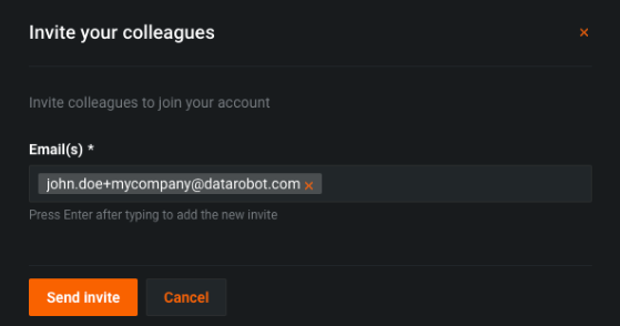 An organization admin must invite a DataRobot employee to their organization using the following format: first_name.last_name+customer@datarobot.com. This creates a DataRobot user that is unique to the organization. Make sure you select the box next to "Send invitation email" before clicking Create user.