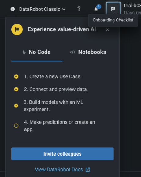 If you are in a trial or POV phase of DataRobot, open Workbench. Then, click the Onboarding Checklist icon at the top of the page and click Invite Colleagues. Alternatively, click the Account Settings icon and select Users.