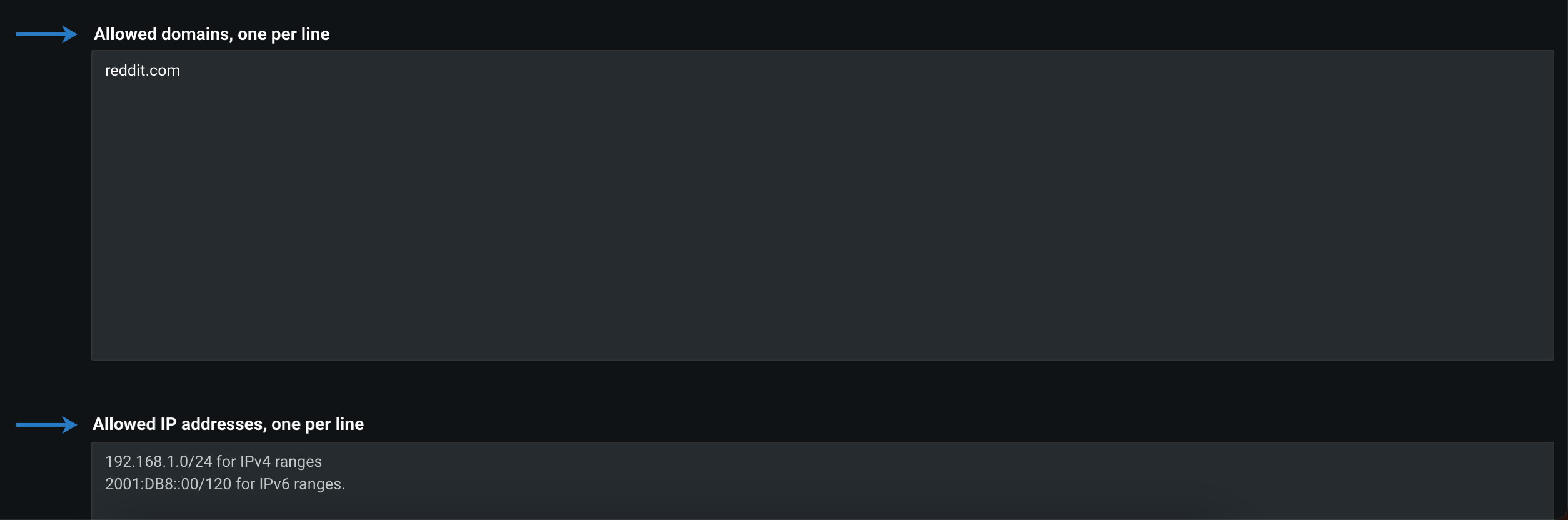 Enter the domains and IP addresses, one per line, that you will allow users to access from within DataRobot. If the domain or IP address is incorrect, an error message appears when you click outside the text field.