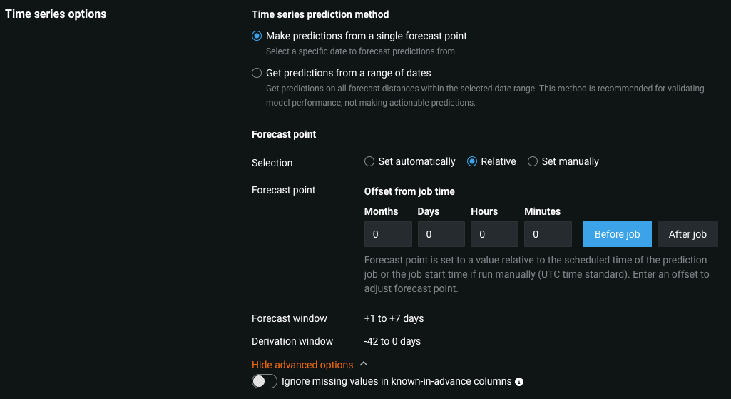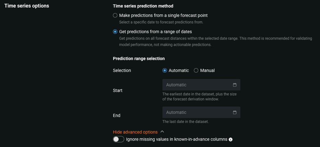 In addition, you can click Show advanced options and enable Ignore missing values in known-in-advance columns to make predictions even if the provided source dataset is missing values in the known-in-advance columns; however, this may negatively impact the computed predictions.