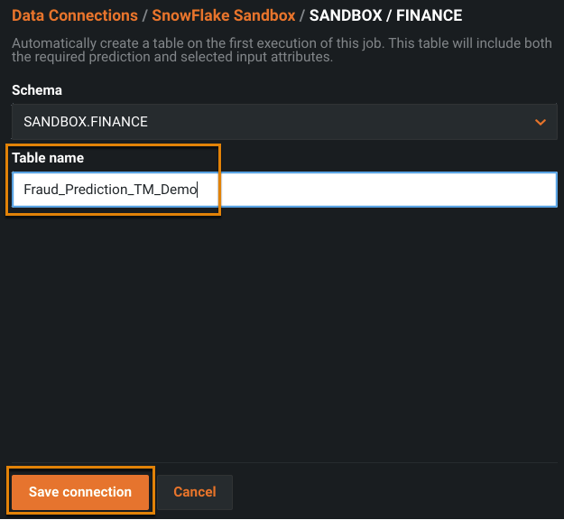 For Prediction destination, select Snowflake as the Destination type and click + Select connection.