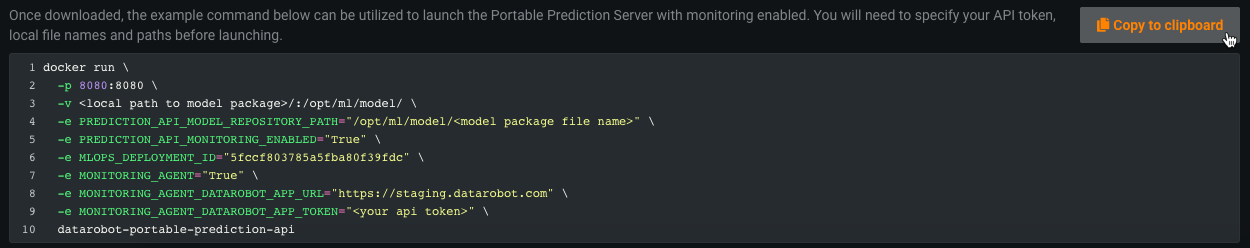 | 4 | Docker snippet | After you download your model package, use the Docker snippet to launch the Portable Prediction Server for the model with monitoring enabled. You will need to specify your API key, local filenames, paths, and monitoring options before launching. |