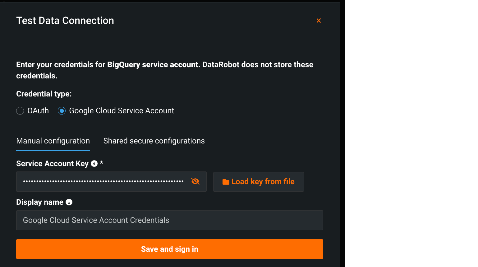| Display name | A unique identifier for your credentials DataRobot. | You can access and manage these credentials under this display name. |
