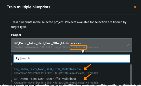Use the current project or change projects from the dropdown. Projects are filtered and available for selection based on commonality of target type with the selected blueprint (multiclass in this example):