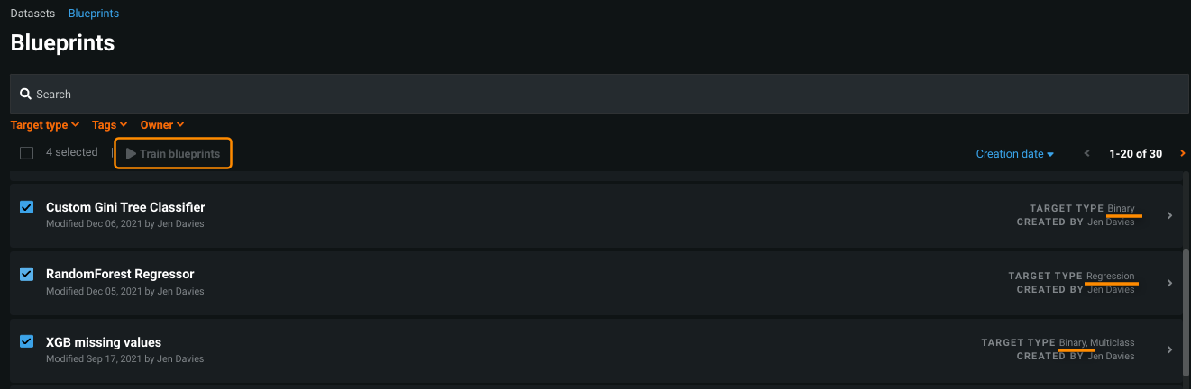 In the AI Catalog, you can apply bulk actions to user blueprints that share the same target type. If selected blueprints don't have at least one common target type, DataRobot prevents bulk training.