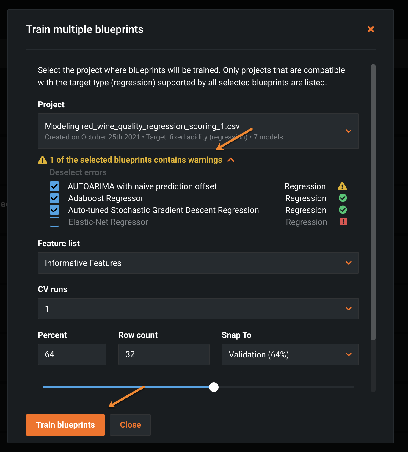 Click Train blueprints and the training modal for multiple blueprints opens. If any of the selected blueprints fail validation, the Train blueprints button is disabled and a message identifies the errored blueprints. Blueprints that include warnings do not block training.