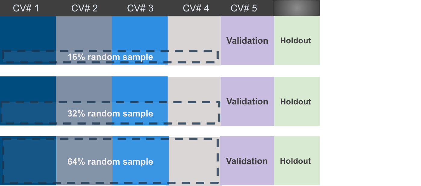When creating splits, DataRobot uses five folds by default. With each round of training, DataRobot uses increasing amounts of data, split across those folds. For full Autopilot, the first round uses a random sample comprised of 16% of the training data in the first four partitions. The next round uses 32% of the training data, and the final round 64%. The Validation and Holdout partitions never change. (Other modeling modes may use different sample sizes).