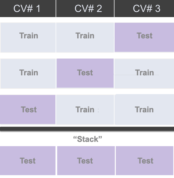 To do this, DataRobot runs cross validation for each model and then "stacks" the out-of-fold predictions. For example, three-fold cross validation can be represented as follows. Note that every row from the training data is present in the stack, but because of the methodology, the "stack" provides out-of-sample predictions on the training data.